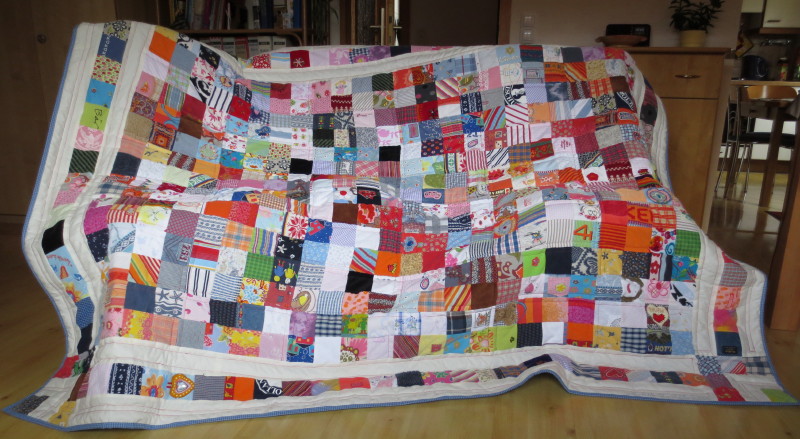 Eine gemeinsam entworfene Erinnerungsdecke für die Tochter zur Jugendweihe. Genäht aus aufgehobener Kinderkleidung, kombiniert mit verschiedenen neuen, bunten Patchworkstoffen.