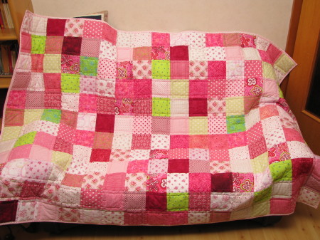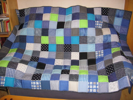Die Mutter hatte das Top (die Oberseite) schon komplett fertig genäht. Ich habe die Decke 3-lagig gesprayheftet und gequiltet. Die Einfassung hat sie dann wieder selber gemacht.